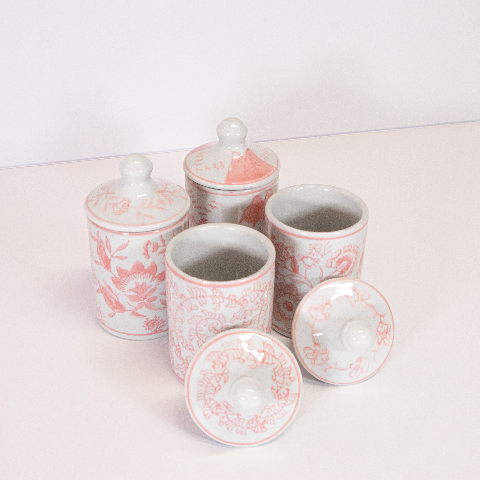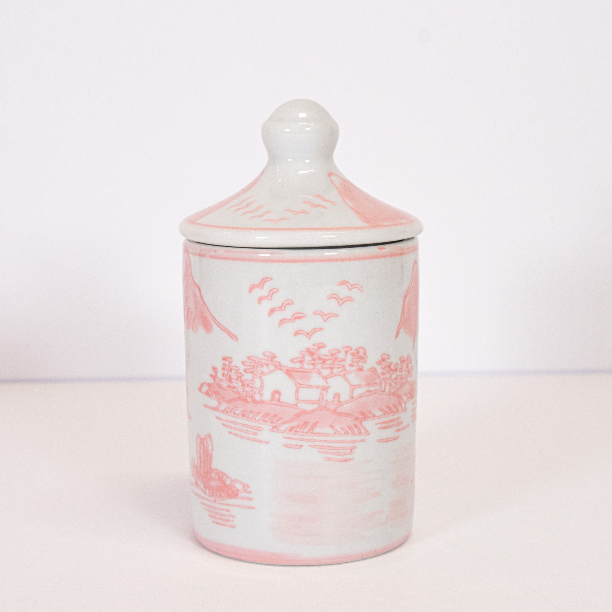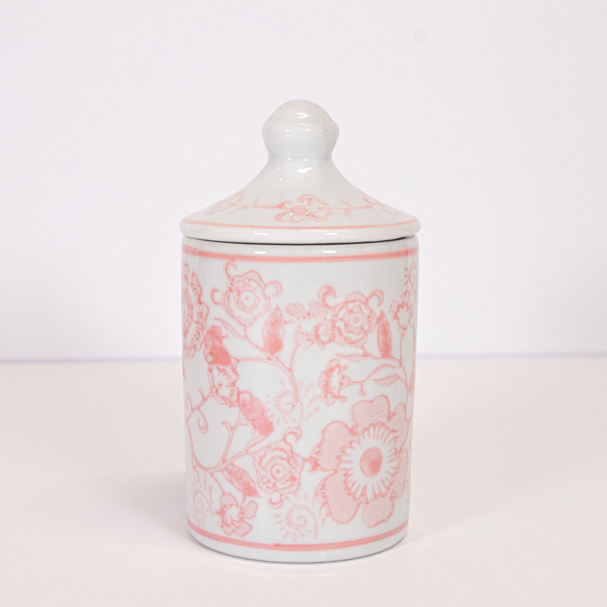White ceramic jar with hand stamped pink floral design